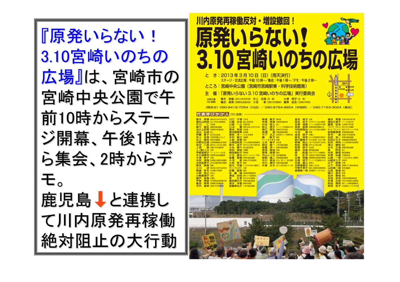 原発いらない!3.10宮崎いのちの広場(宮崎中央公園・10:00~、13:00集会、14:00デモ)