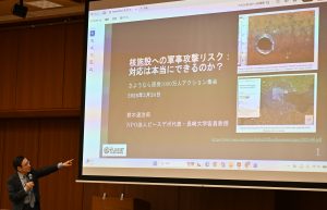 また核施設への軍事攻撃を防止する規制や条約などについて、現状の枠組みは国内テロ対策については言及があるものの、軍事攻撃については対象外である点に疑問を投げかけ、ジュネーブ条約第1議定書にある原子力発電所への攻撃を規制する条文も条文解釈の余地を残しており注意が必要だと話しました。そして民間研究団体などによる核セキュリティーにかかわる研究や提言を紹介しつつ、最後に国際条約を強化することや、インドとパキスタン間で成立している協定を参考にして、二国間協定などで、核施設への攻撃を禁止する枠組み作りをするよう訴えていくことが重要だとしました。