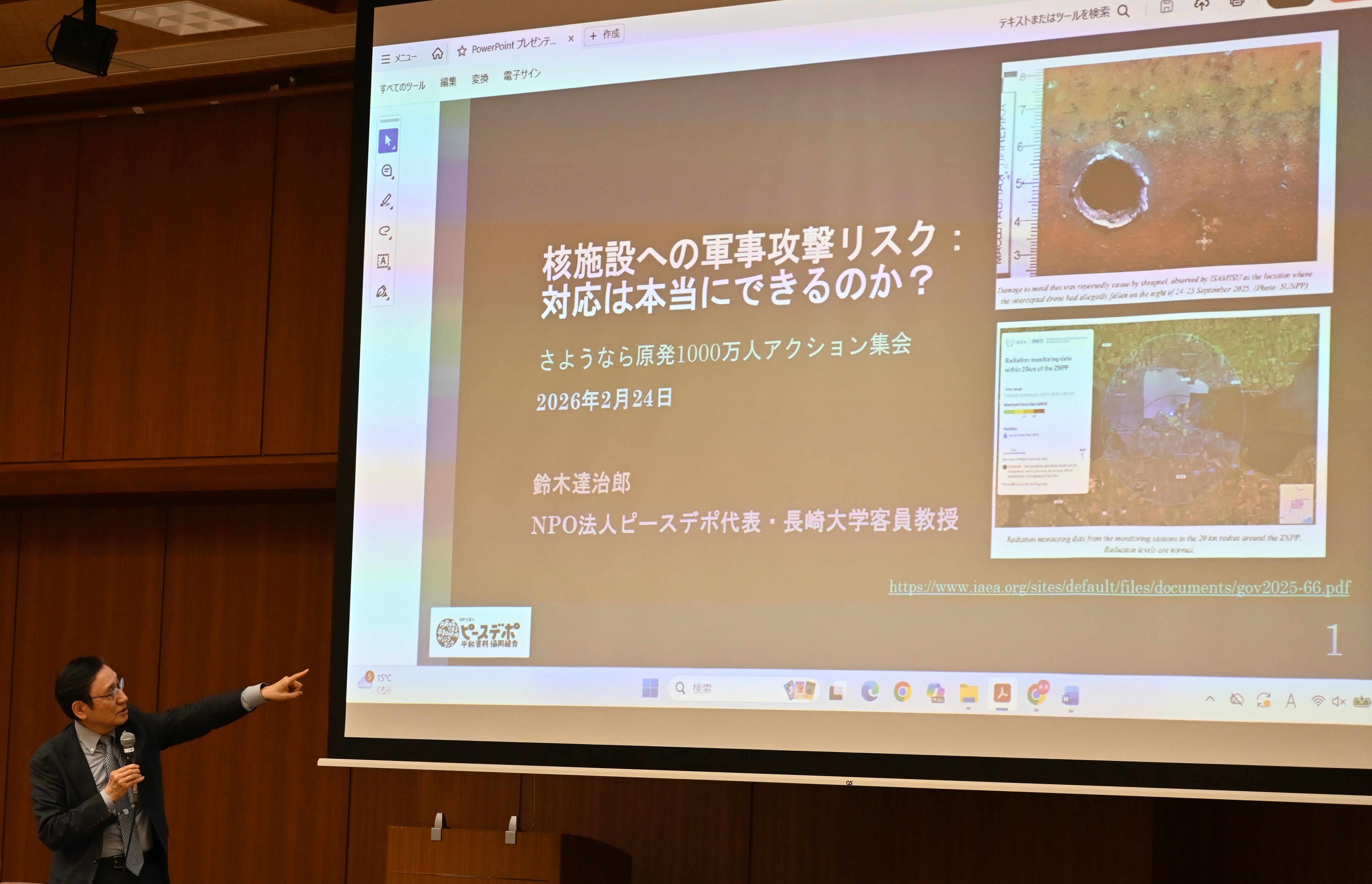 講師の鈴木達治郎さん(NPO法人ピースデポ代表・長崎大学客員教授)は、実際に起きたロシアによるウクライナのザポリージャ原発攻撃、イスラエルとアメリカによるイランの核施設への攻撃の実態について説明し、また韓国の原発が攻撃を受けた場合の民間団体による被害シミュレーションを題材にして、原発が軍事攻撃を受けた場合の深刻な影響について語りました。